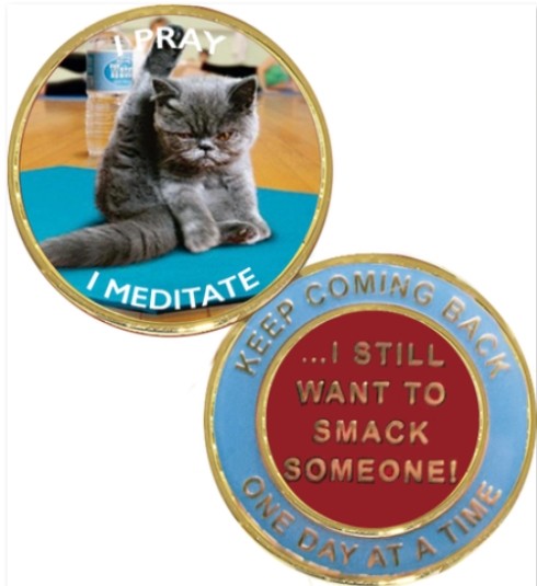 Sometimes a little humor is required! A great coin to give to a sponsee or an old timer, fitting for all! Grey fluffy, angry cat, on blue yoga matt, with brown flooring in yoga studio. On the back, "Keep Coming Back. One Day At A Time" and "...I still want to smack someone!" Light blue trim with gold lettering, center is red with gold writing.