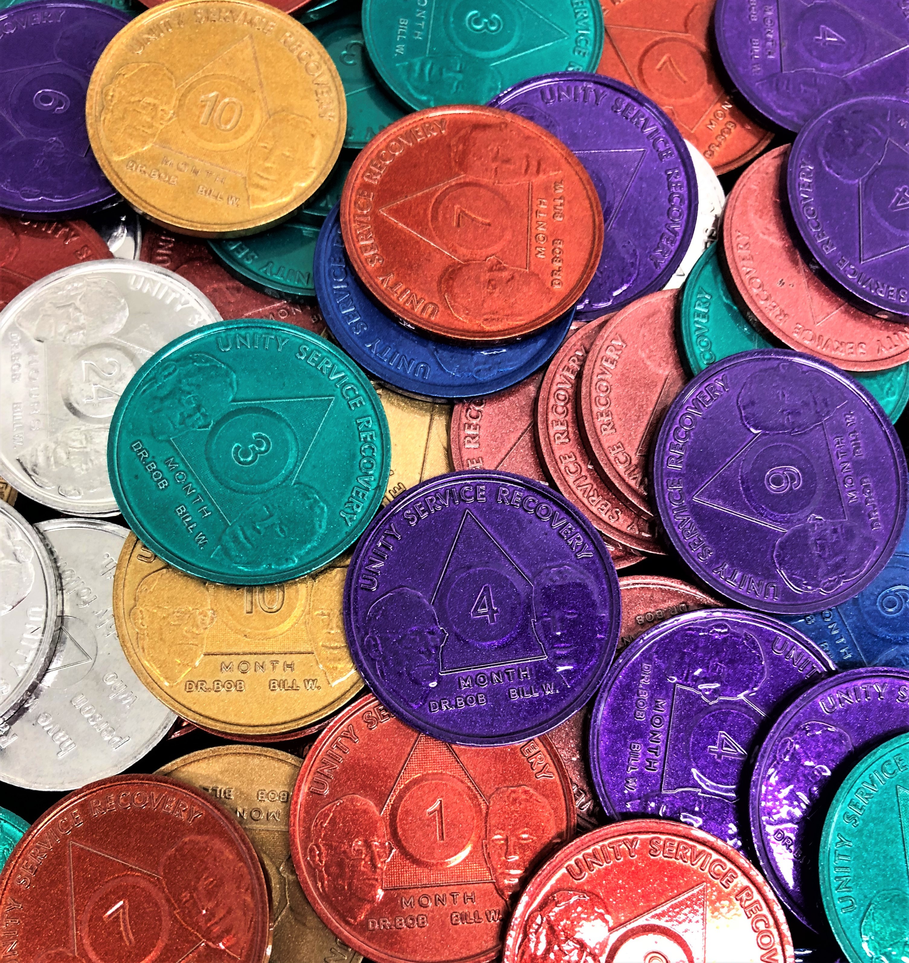 These Bill & Bob aluminum chips celebrate the first year of sobriety. The leangh of sobriety ranges from welcome chips to 11 months. The phrase " Rarely have we seen a person fail who has thoroughly followed our path" is printed on the back of these AA aluminum chips.